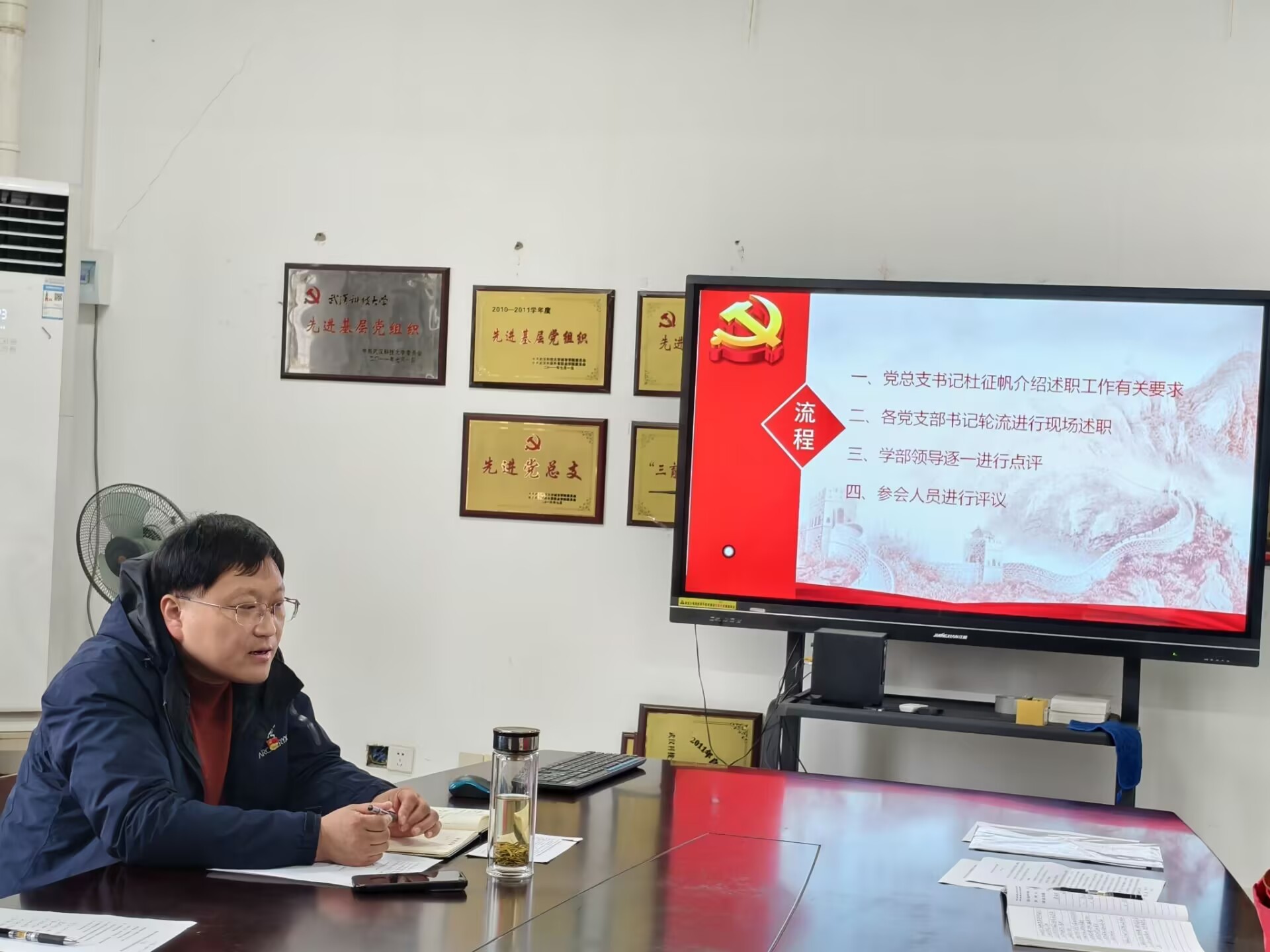 会议伊始,杜征帆书记介绍了会议相关要求和流程,强调了本次述职评议会议的重要意义。其次各位党支部书记依次围绕学习贯彻习近平新时代中国特色社会主义思想、落实立德树人根本任务、落实基层党建责任、围绕中心、服务大局,推进“一融双高”、落实全面从严治党主体责任这五个方面党建工作重点依次述职,分别介绍了各党支部2024年党建工作开展情况、存在的突出问题和下一步工作打算。