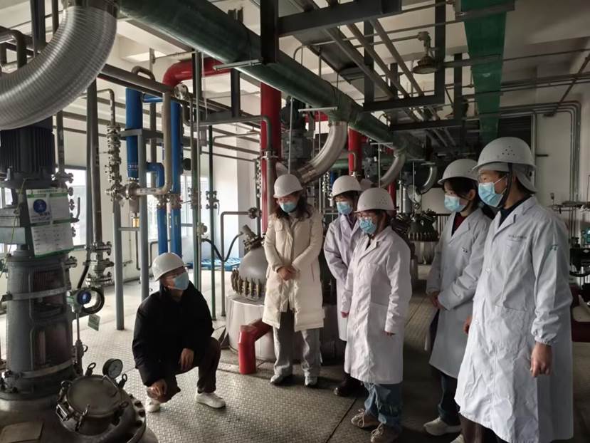在严格遵循GMP规范的防护措施下,老师们进入原料药生产核心区。技术总监方总现场讲解,以茴三硫的硫化工段为例,简要介绍车间工艺原理、车间装置及自动化、智能化管控原理,药学系实习带教教师孙世猷为其他老师补充讲解车间硫化工艺的具体操作过程,其他教师纷纷参与讨论,并记录下多个可转化为教学案例的技术细节。