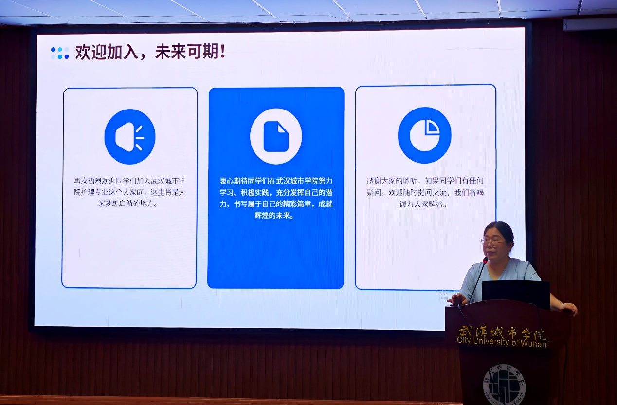 讲座尾声,高彦茹老师欢迎道:“热烈欢迎同学们加入武汉城市学院护理专业大家庭,这里是大家梦想启航的地方。”她期待同学们在校努力学习、积极实践,书写精彩未来。最后表示:“感谢聆听,若有疑问,欢迎随时提问交流,我们会为大家解答。”