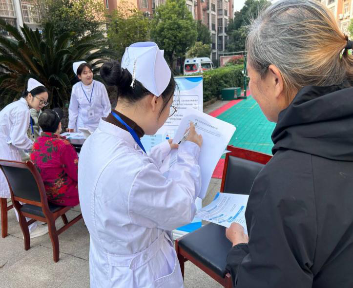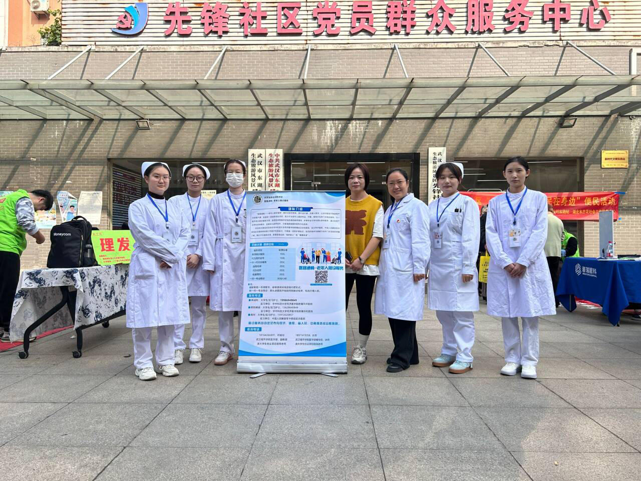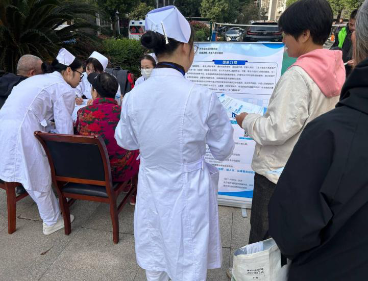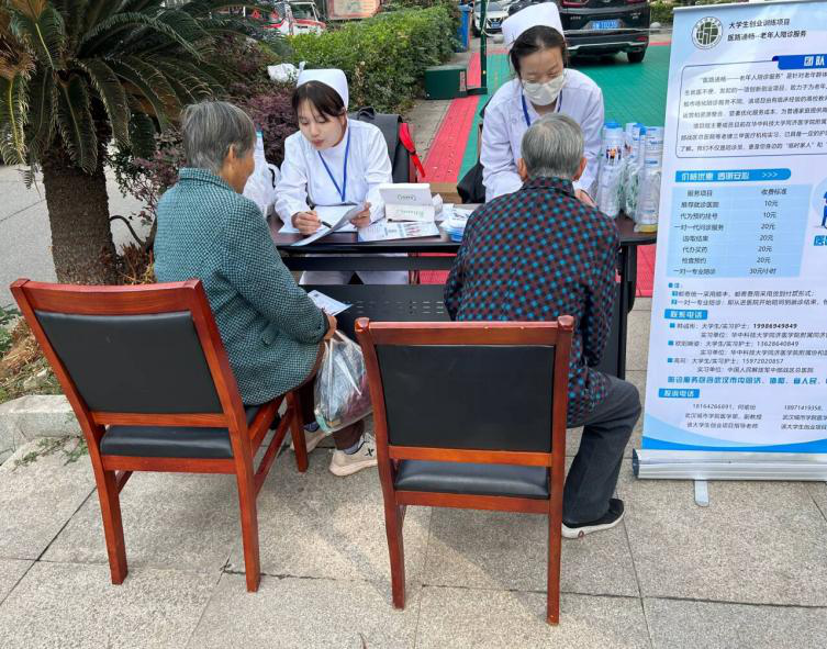 目前该项目从调研、建网站,现已进入宣传阶段,2025年11月11号,先锋社区党群服务中心举办便民活动,何老师也带着项目组成员身着护士服,参与其中,她们支起展板、围坐桌前,耐心向居民讲解陪诊服务的细节——这不是一次普通的宣传,是一群青年用专业叩响民生需求的实践。