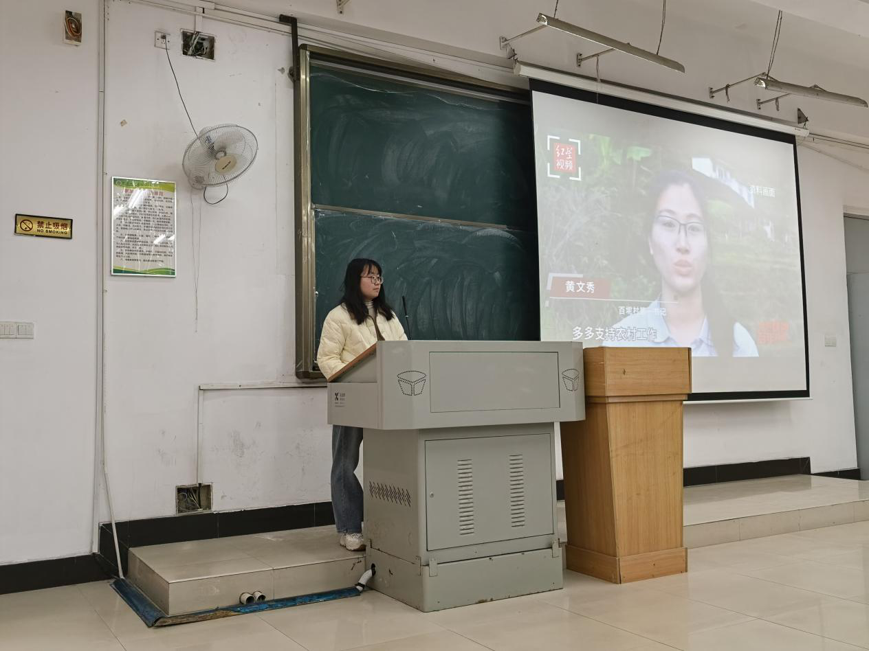 郝瑜老师还为大家播放了黄文秀事迹的视频,引发全场共鸣。视频中黄文秀放弃城市优渥条件,投身脱贫攻坚,最终将生命定格在扶贫路上。她用青春践行初心的故事,让团员们深刻领悟:新时代青年的担当是把个人理想融入国家需求的实际行动,是在祖国需要的地方发光发热的坚定选择。