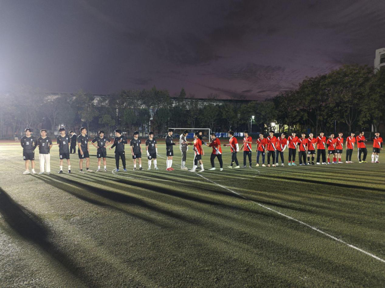 月光下,医学部队员们的黑红色身影在赛场上来回穿梭,每一次冲刺都凝聚着汗水,每一次对抗都展现着韧性。他们在比赛中不断复盘交流,力求每一个动作都精准到位。最终,这场较量以2:1的比分落幕,医学部再度憾负,但相较于首场比赛,队员们在战术执行与临场应变上的进步有目共睹。比赛尾声,全体队员向现场观众鞠躬致意,用谦逊态度赢得阵阵掌声。