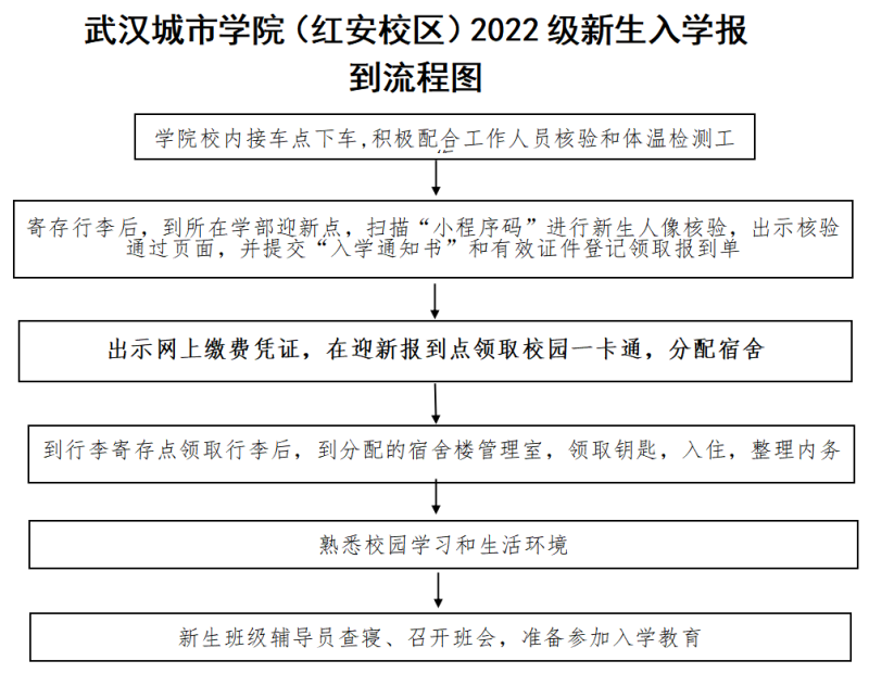 3、自行来校报到的学生,从武汉城市学院红安校区2号门入校,入校时请保持社交距离,出示健康码、绿色行程卡和24小时核酸检测阴性证明,配合工作人员开展消杀、体温检测和身份查验。