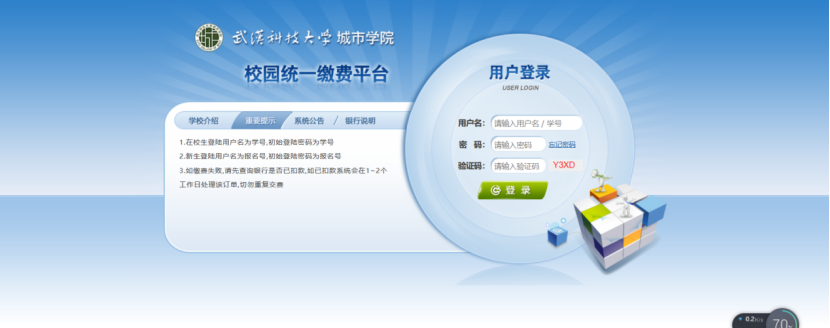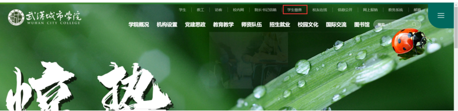 第一步:武汉城市学院官网顶端找到”学生缴费”点击,进入校园统一缴费平台。