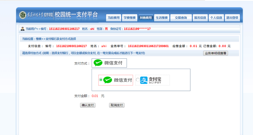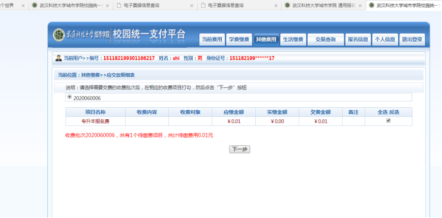 第三步:点击“其他费用”按钮,选择缴费项目和金额,按照页面提示完成缴费(请使用微信或支付宝缴费)。
